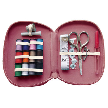 Measuring 140 x 95 x 30mm, contain 12 reels of cotton, scissors, a tape measure, buttons, safety pins, seam ripper and a thimble.